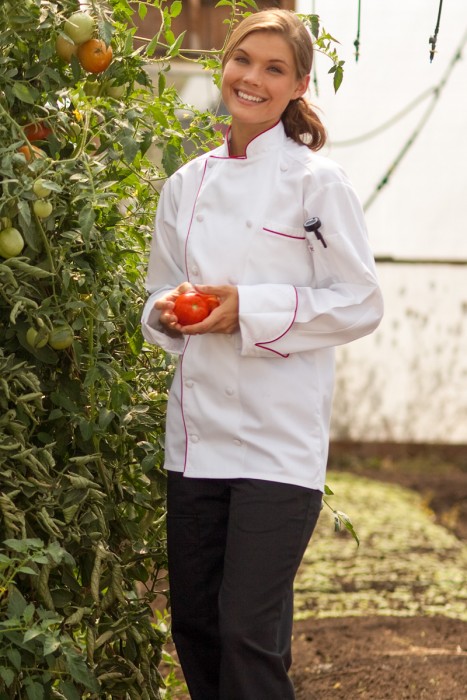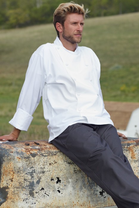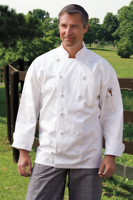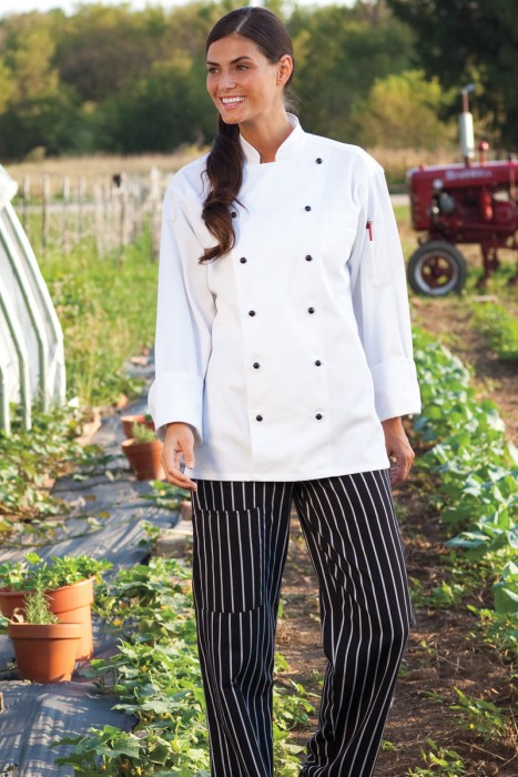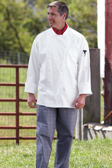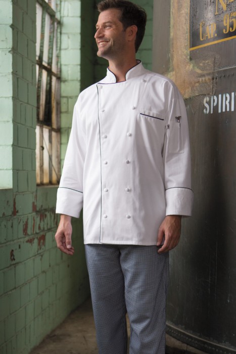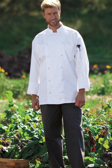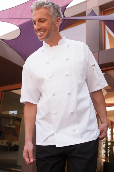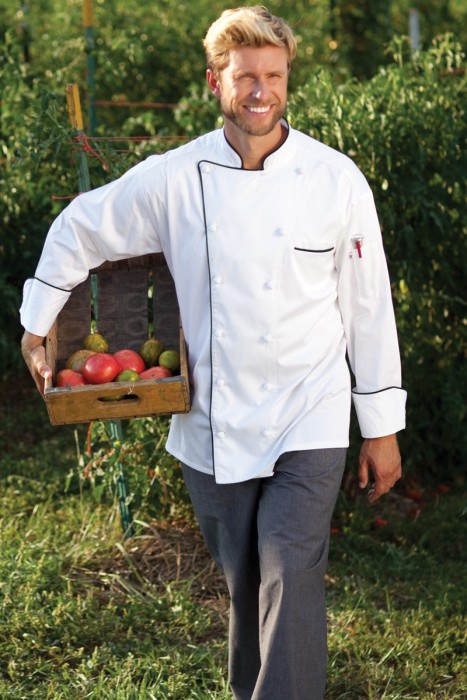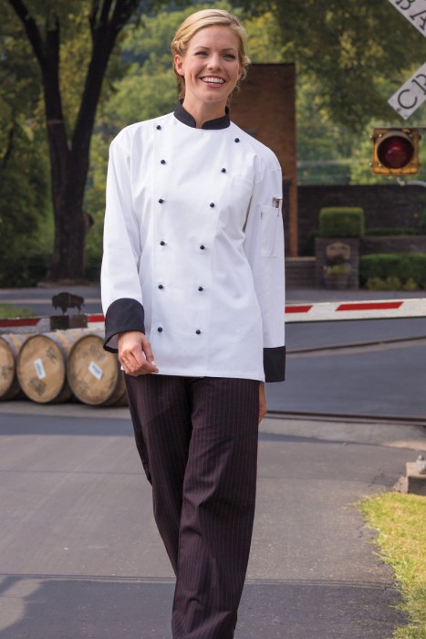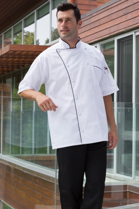 Trimmed with a black collar, black inner cuffs and twelve removable black stud buttons, this chef coat gets top ratings. Expertly crafted with an inset pocket, sewn underarm vents and three-piece executive back.