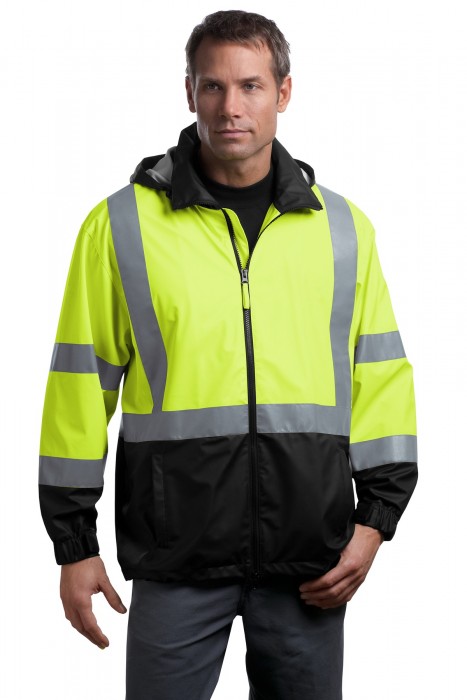 Stay safer in inclement weather in this high-visibility long windbreaker. It comes with snap off hood and draw cord hem with toggle adjustability, two welt pockets and internal storm flap. This product complies with Class 3 Level 2 requirements of ANSI/ISEA 107-2010.